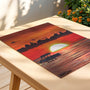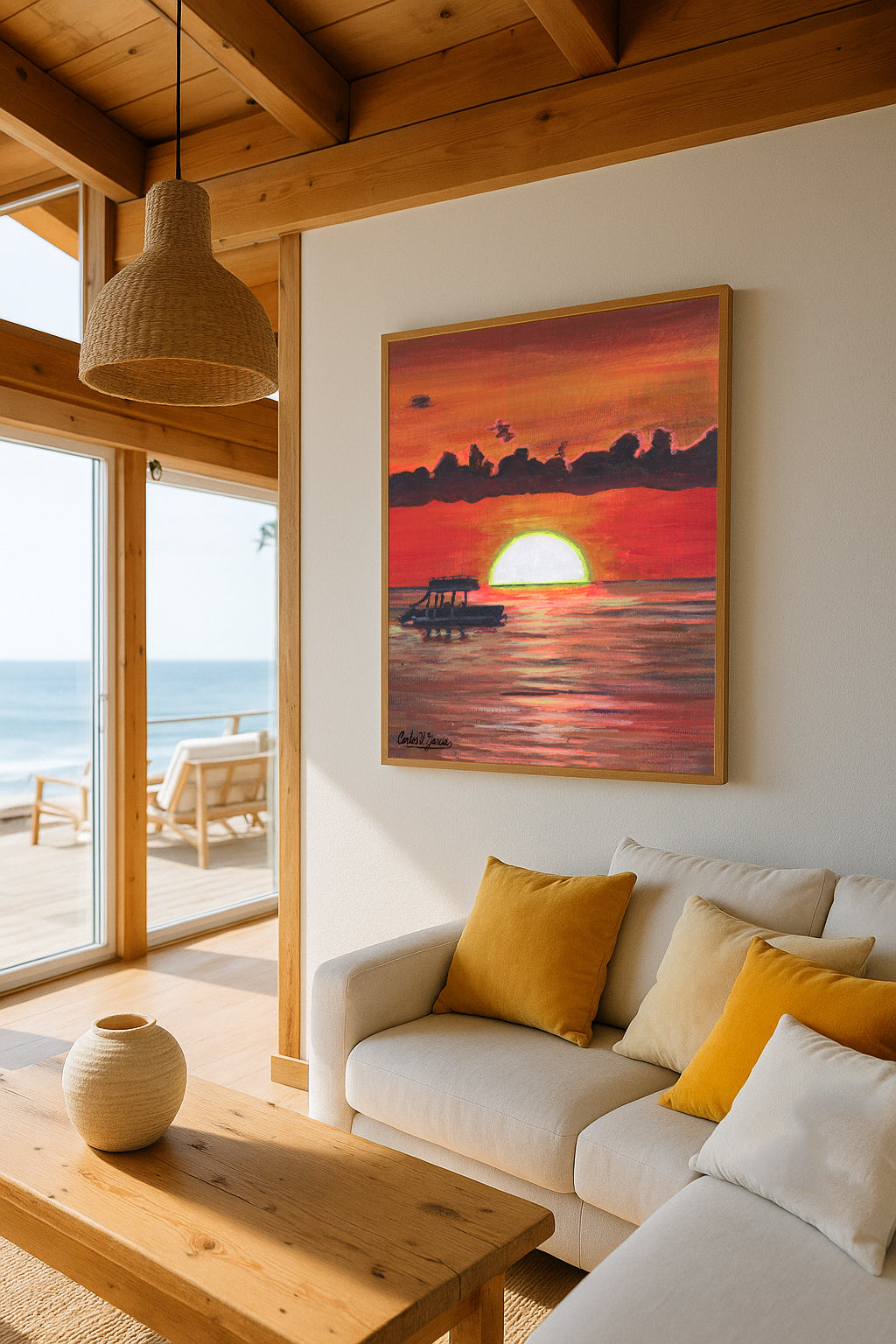 The sun drops to the horizon, washing the sea in bands of orange and red. A boat moves across calm water, an easy Cayman evening.